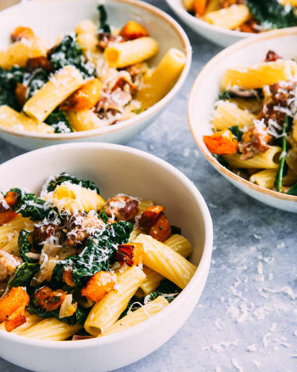 Both winter squash and kale can have a tendency to feel a bit heavy if they aren't seasoned properly. Here, a big splash of white wine solves that problem by adding acidity and brightness.