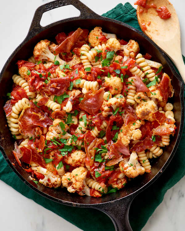This dish is more about the smoky, tender cauliflower than the noodles, which is exactly why we love it. You can skip the crispy prosciutto if you'd like to keep this meatless, but it does add a nice, salty crunch so you'll want to sprinkle over some asiago or Parm for a similar effect.